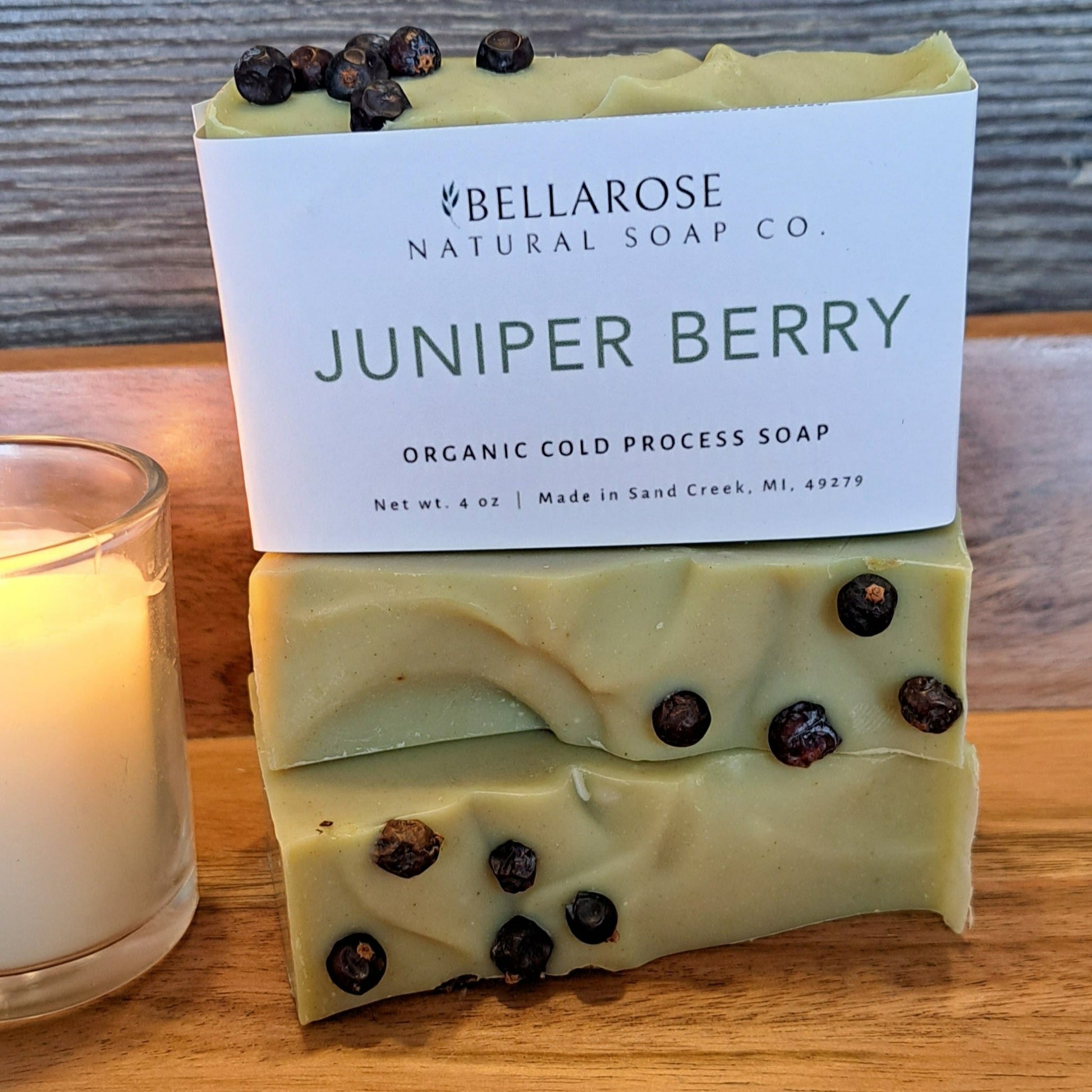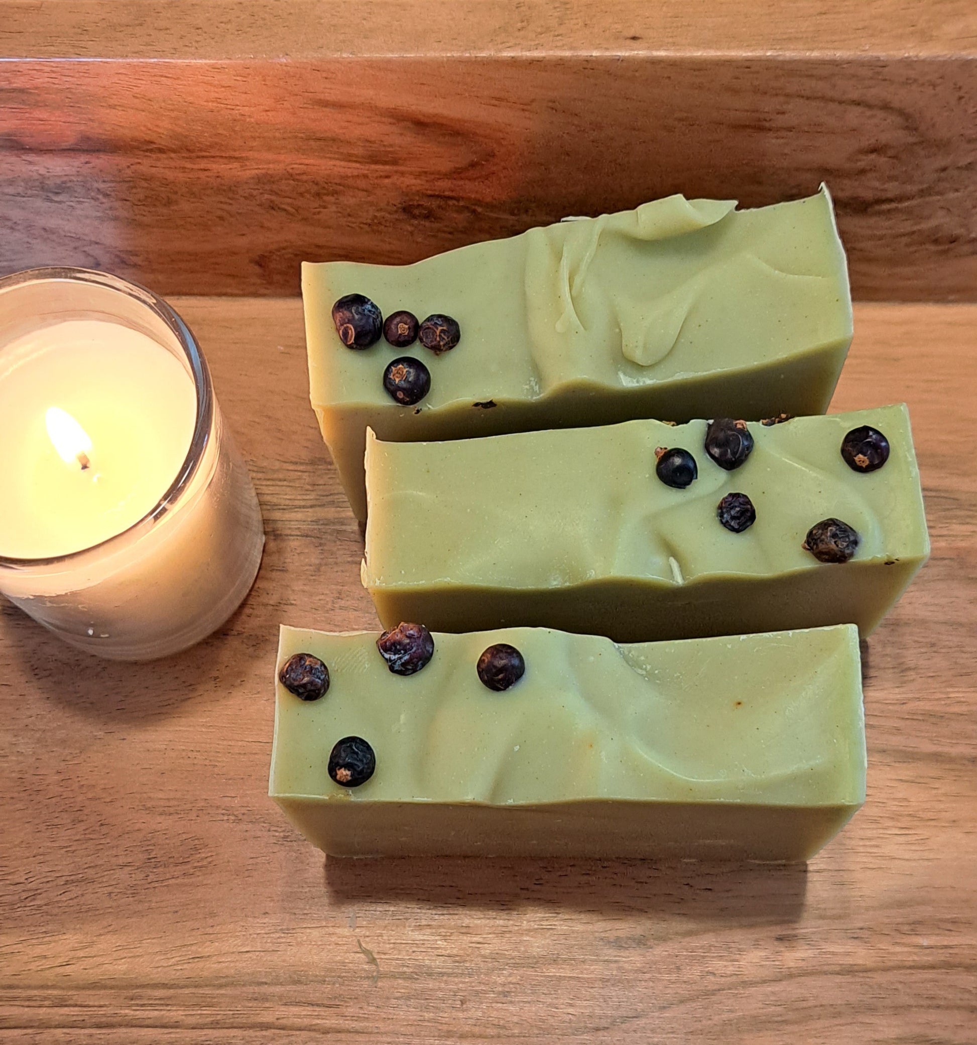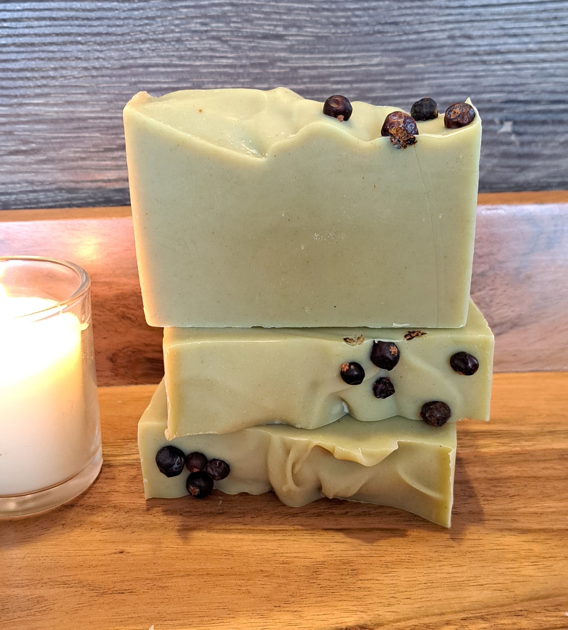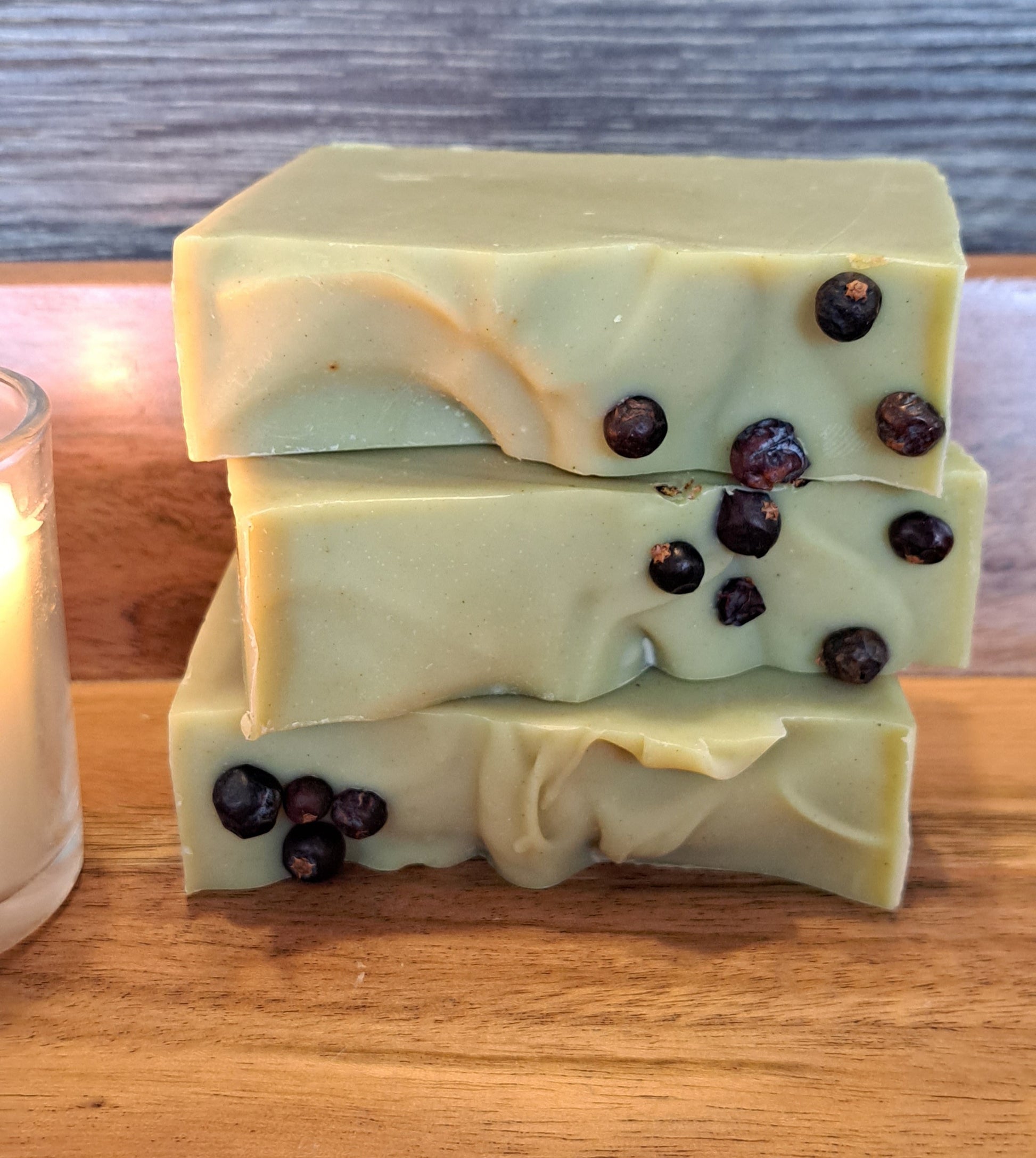 Awaken with our lovely organic Juniper Berry soap! Woodsy yet slightly sweet. Colored naturally with Indigo Powder and scented with Juniper Berry essential oil. Topped with some dried Juniper Berries for a finishing touch!