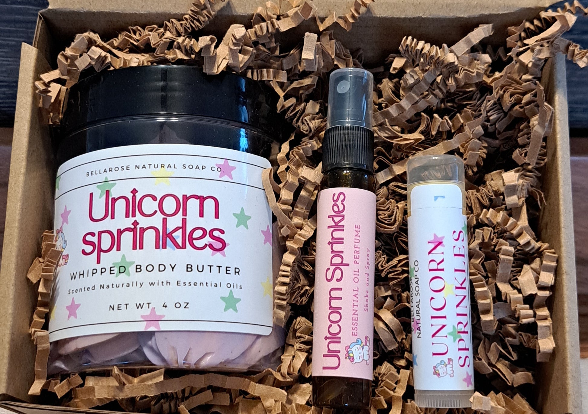 This set includes our 4 Oz Unicorn Sprinkles Whipped Body Butter, Our 9 ml Unicorn Sprinkles Essential Oil Perfume, and our .15 Oz Unicorn Sprinkles Lip balm!