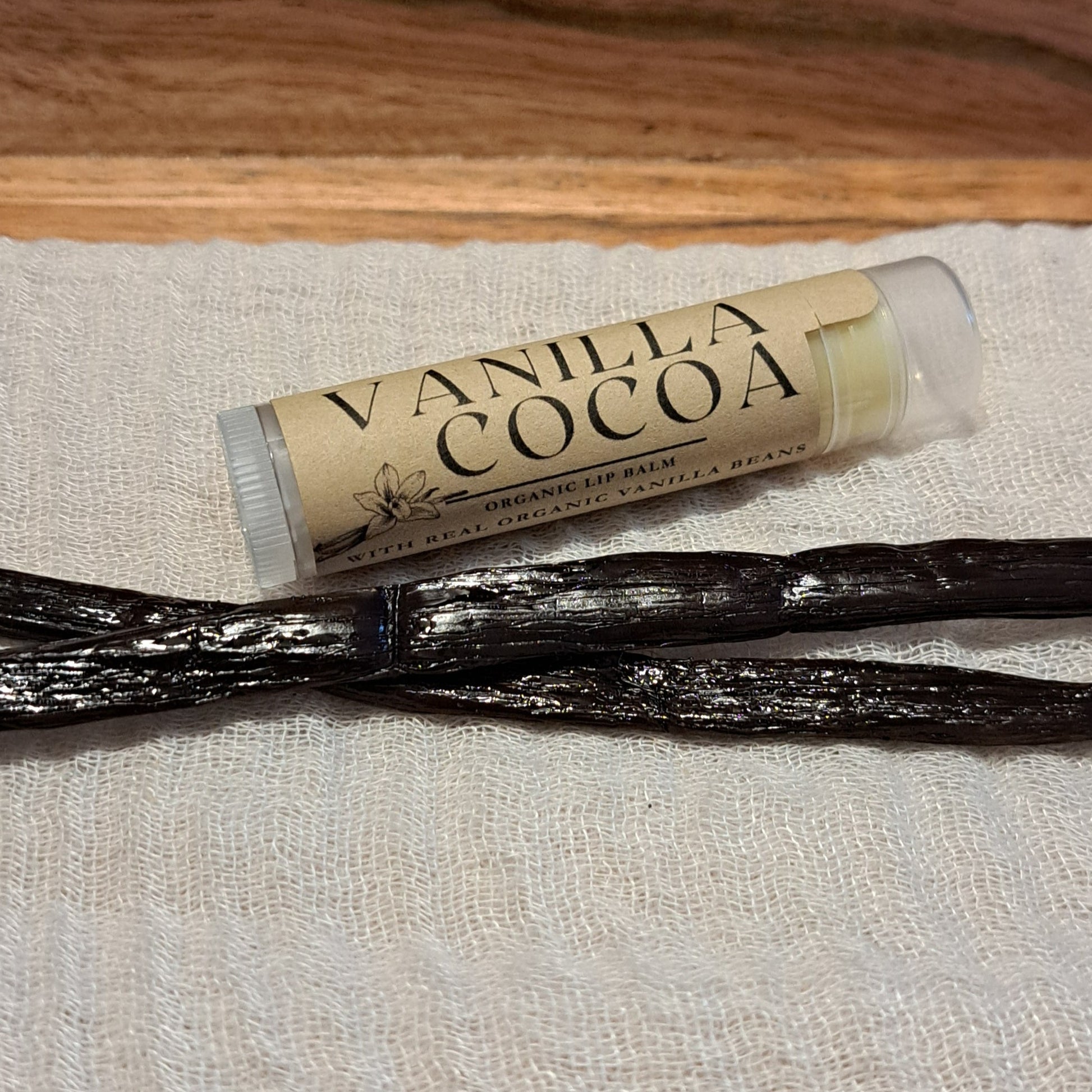 Our Vanilla Cocoa lip balm is one of our best sellers understandably. It is made from real Organic Vanilla Beans infused in Organic Sweet Almond Oil. It smells just like Vanilla Cocoa with the vanilla beans and the cocoa butter! It comes in .15 Oz roll up tube.